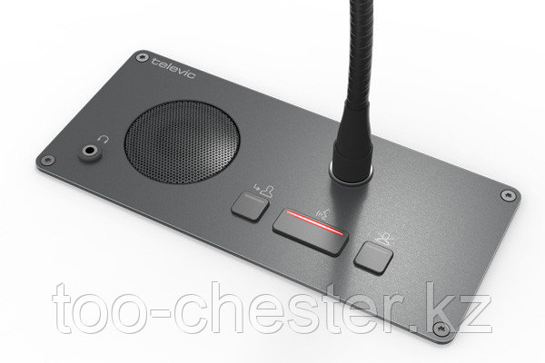 Пульт председателя для дискуссионных систем, на верхней панели которого установлен динамик, разъем для наушников и микрофон на гибкой подставке. Среди кнопок управления присутствуют: кнопка включения микрофона, приоритета и включения следующего в очереди микрофона. Кнопка включения микрофона оснащена индикацией активности.